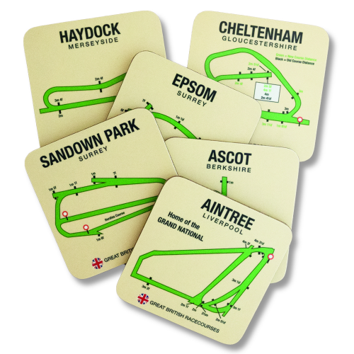Set of six IJF 'UK Racecousre' design coasters.Featuring Aintree, Ascot, Cheltenham, Epsom, Haydock and Sandown. 10cm x 10cm. Melamine. Made in the UK.