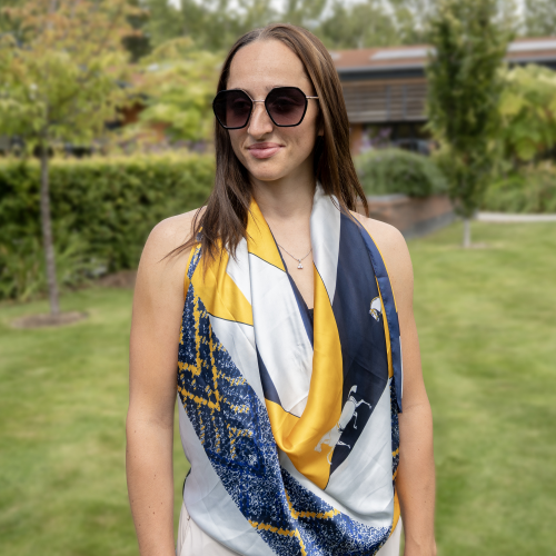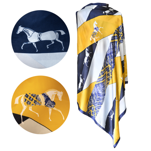 Elegant horse design in blue and yellow. This stylish lightweight scarf/wrap is perfect for many occasions. L 185cm X W 90cm 100% Polyester