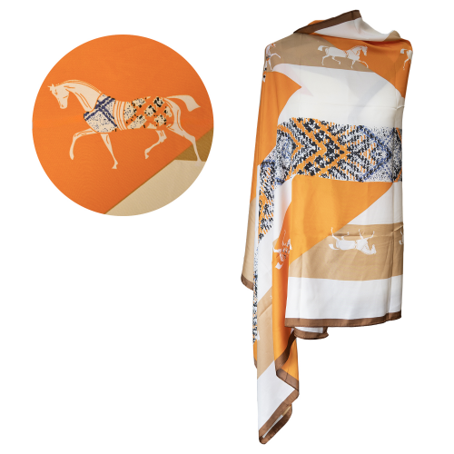 Elegant horse design in orange and caramel. This stylish lightweight scarf/wrap is perfect for many occasions. L 185cm X W 90cm 100% Polyester