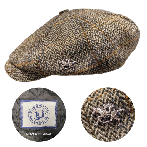 A classic horse racing flat cap with a stylish herringbone pattern, complete with an IJF jockey pin badge for an equestrian touch. Perfect for race days or everyday wear.